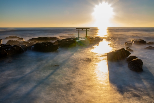 波しぶきが舞い、朝日が鳥居を黄金色に染める光景は、言葉を失うほどの神々しさです。