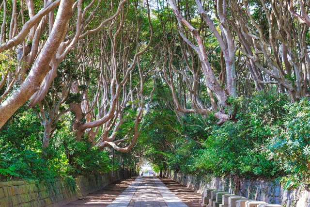 見どころは、樹齢300年を超えるヤブツバキが作る神秘的な「樹列の参道」です。