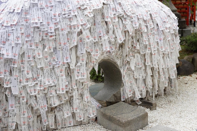 境内中央に鎮座する「縁切り縁結び碑」には、切実な願いが書かれた形代が隙間なく貼られています。