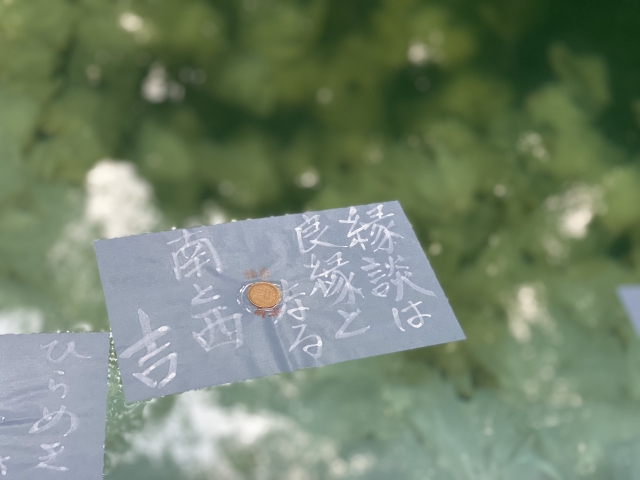 紙が早く沈めば良縁が近く、遠くに流れていけば遠方の人と縁があると言い伝えられています。