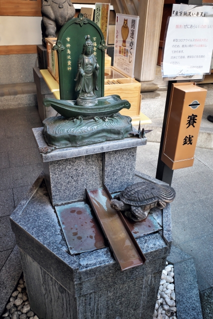 ザルに種銭を入れ、境内の水で丁寧に浄めてください。