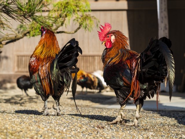ここでは桜と共に、神様のお使いとされるニワトリが境内で自由に過ごしています。