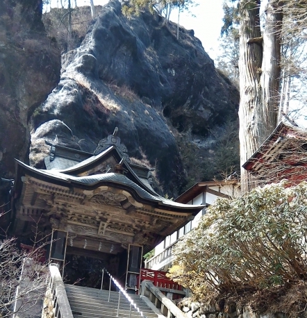 山の空気、杉木立、岩の迫力が印象に残る神社です。